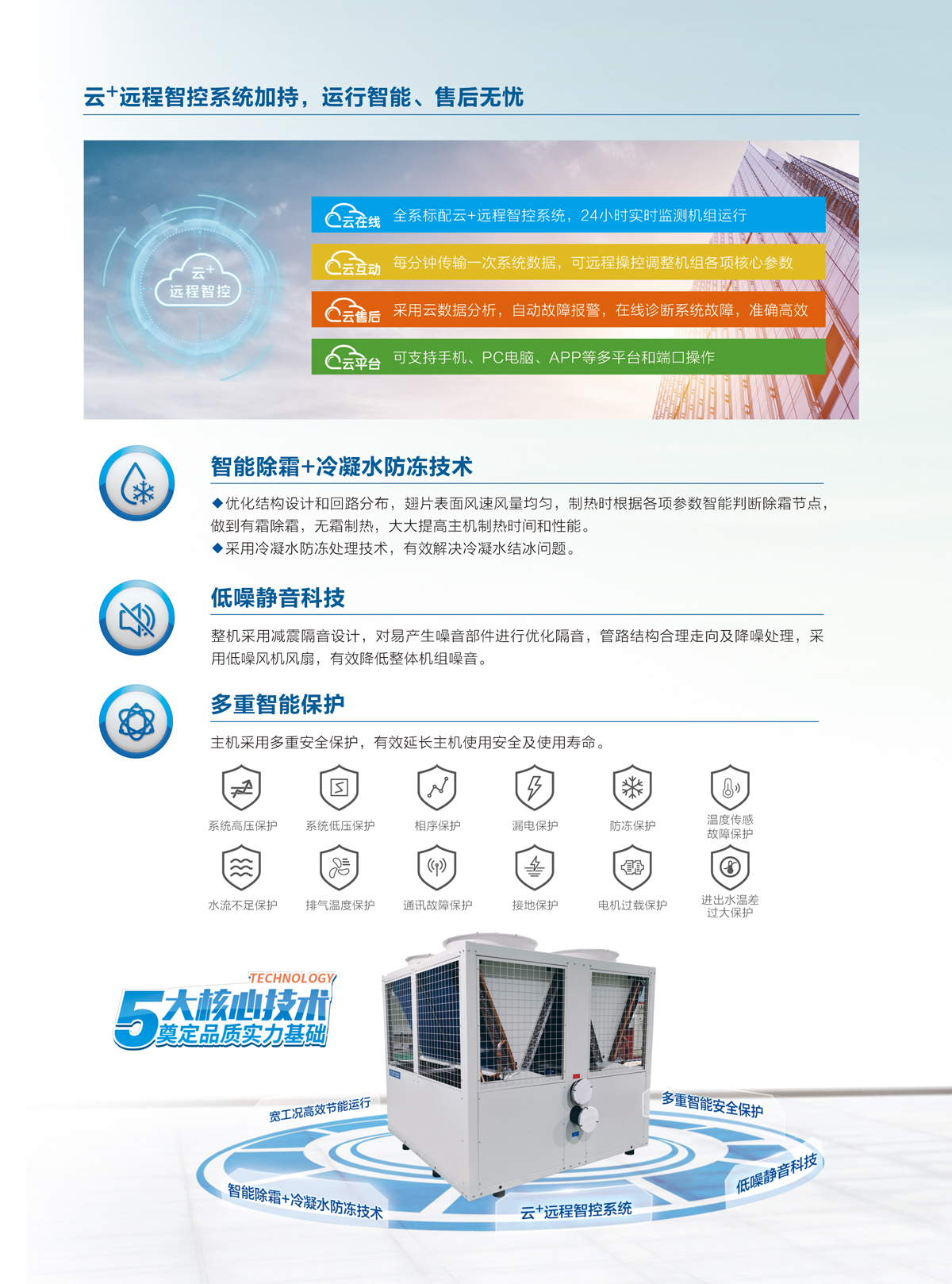 一鍵智能運行,操控便捷,無需值守??蛇x配熱泵云智控系統,PC、手機端實時監測機組運行,一鍵遠程控制